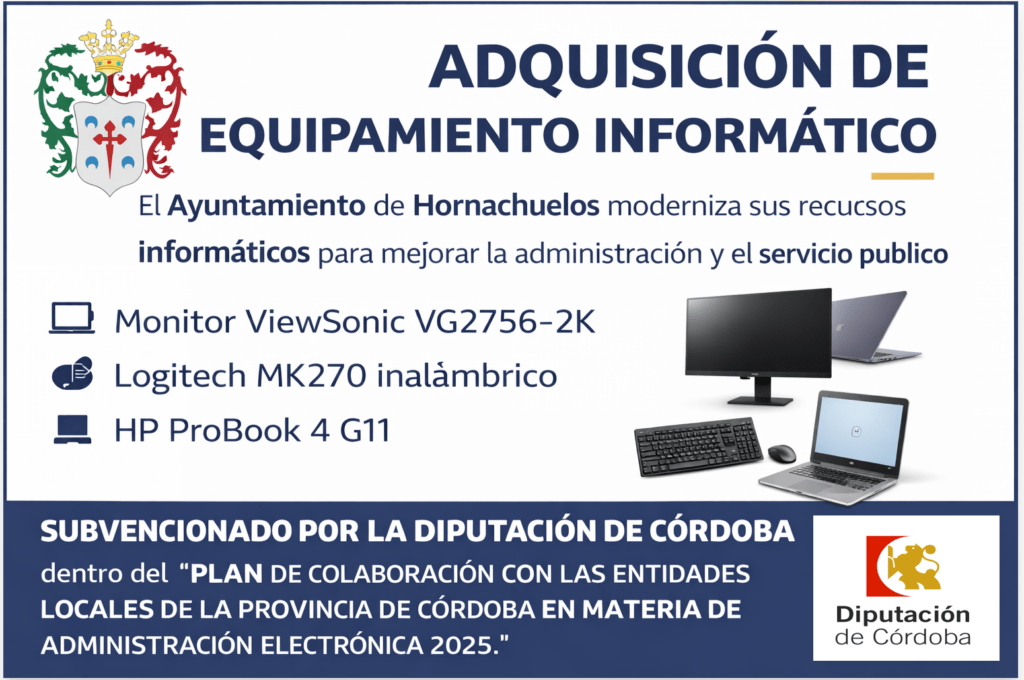 El Ayuntamiento de Hornachuelos informa a la ciudadanía de la ejecución del proyecto de mejora de infraestructuras tecnológicas municipales mediante la adquisición de nuevo equipamiento informático, con el objetivo de modernizar los recursos disponibles, mejorar la eficiencia de los servicios públicos y reforzar la administración electrónica.
