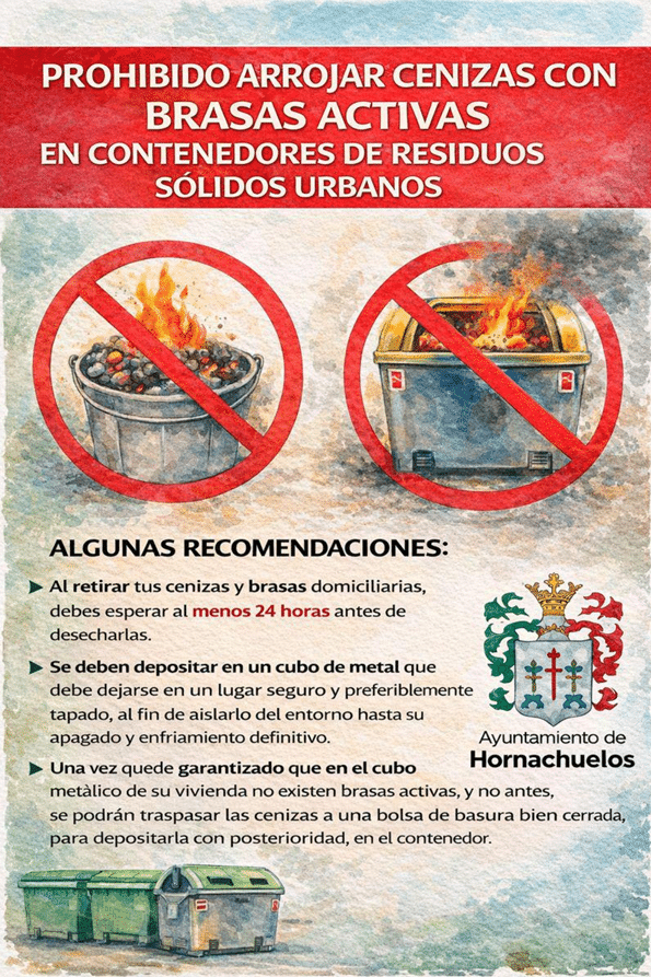 El Ayuntamiento de Hornachuelos informa a la ciudadanía que, durante la época de otoño e invierno, es habitual el uso de chimeneas, estufas y braseros que emplean leña o biomasa natural como combustible. Como consecuencia de su utilización, se generan cenizas y brasas que, si aún se encuentran calientes, suponen un grave peligro cuando se depositan en los contenedores de residuos sólidos urbanos.
