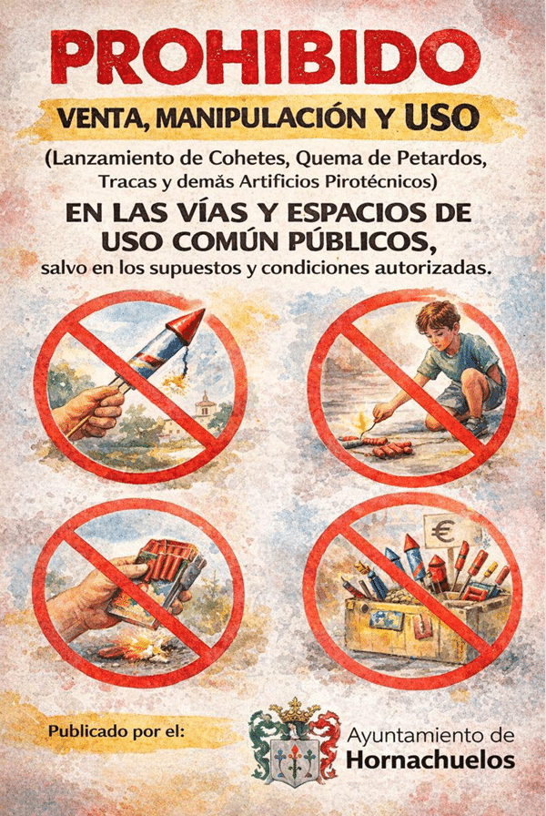 El Ayuntamiento de Hornachuelos informa a la ciudadanía que, con motivo de las fiestas navideñas y otros eventos, se ha dictado Bando municipal por el que se establece la prohibición expresa de la venta, manipulación y uso de petardos, cohetes, tracas y demás artificios pirotécnicos en las vías y espacios de uso común públicos, salvo en los supuestos y condiciones legalmente autorizadas.