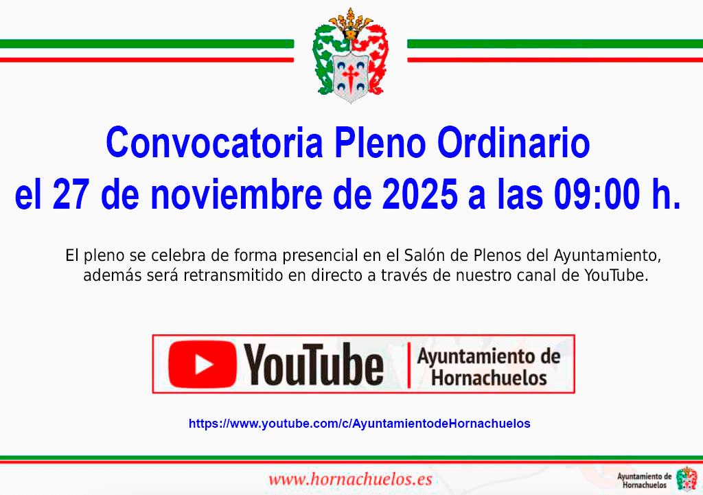 La sesión podrá seguirse en directo a través del canal de Youtube del Ayuntamiento de Hornachuelos https://www.youtube.com/c/ayuntamientodehornachuelos
