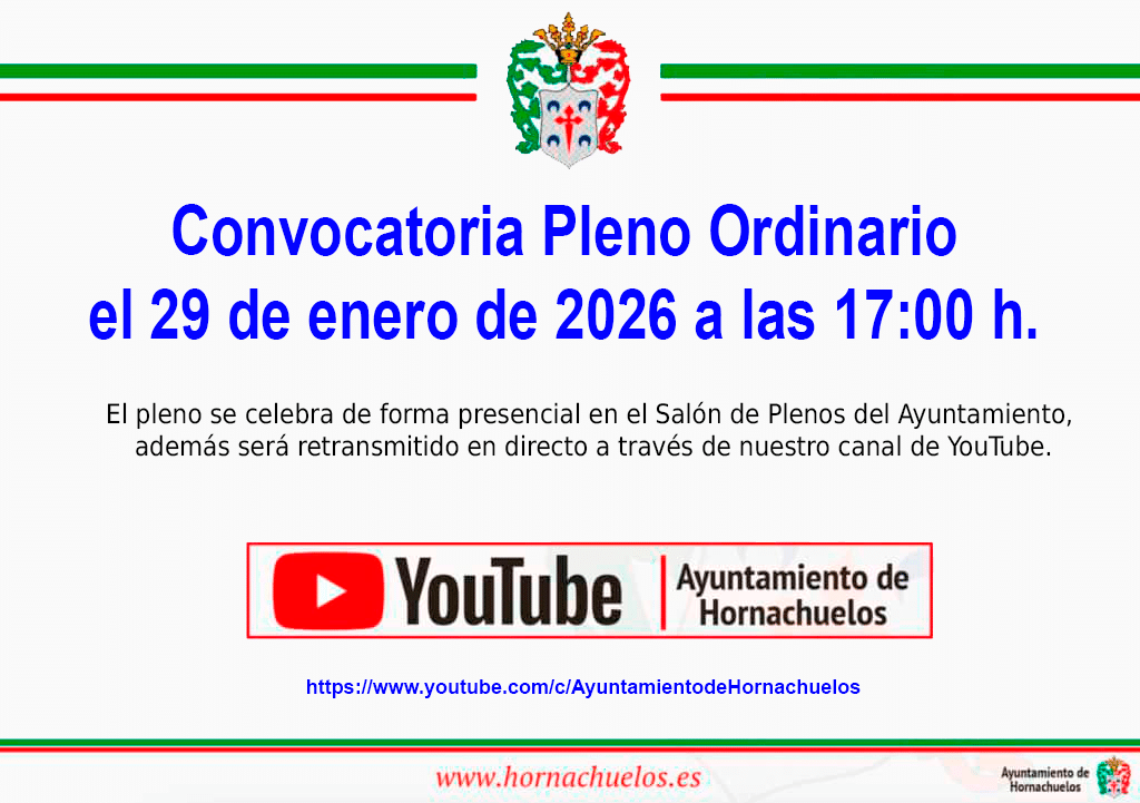 La sesión podrá seguirse en directo a través del canal de Youtube del Ayuntamiento de Hornachuelos https://www.youtube.com/c/ayuntamientodehornachuelos