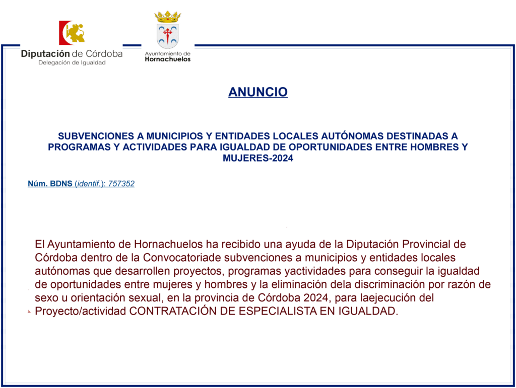 El Ayuntamiento de Hornachuelos ha recibido una ayuda de la Diputación Provincial de Córdoba, dentro de la convocatoria de Subvenciones a municipios y entidades locales autónomas destinadas a programas y actividades para la igualdad de oportunidades entre hombres y mujeres 2024.