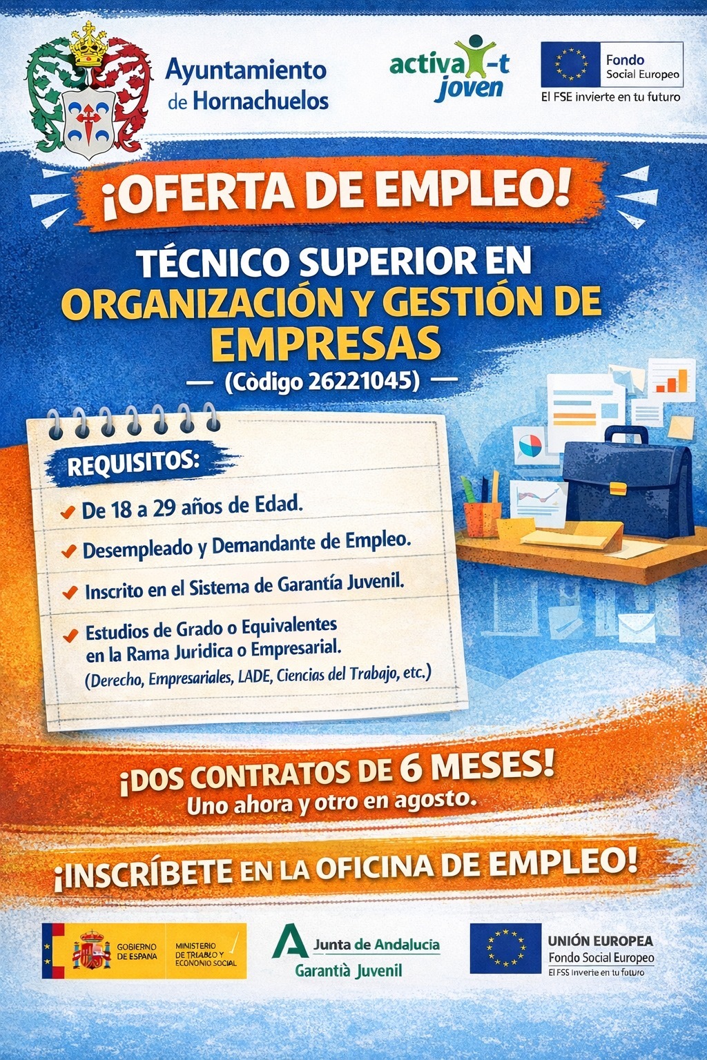 El Ayuntamiento de Hornachuelos informa de la apertura de una oferta de empleo para la ocupación de Técnico Superior en Organización y Gestión de Empresas (Código 26221045).